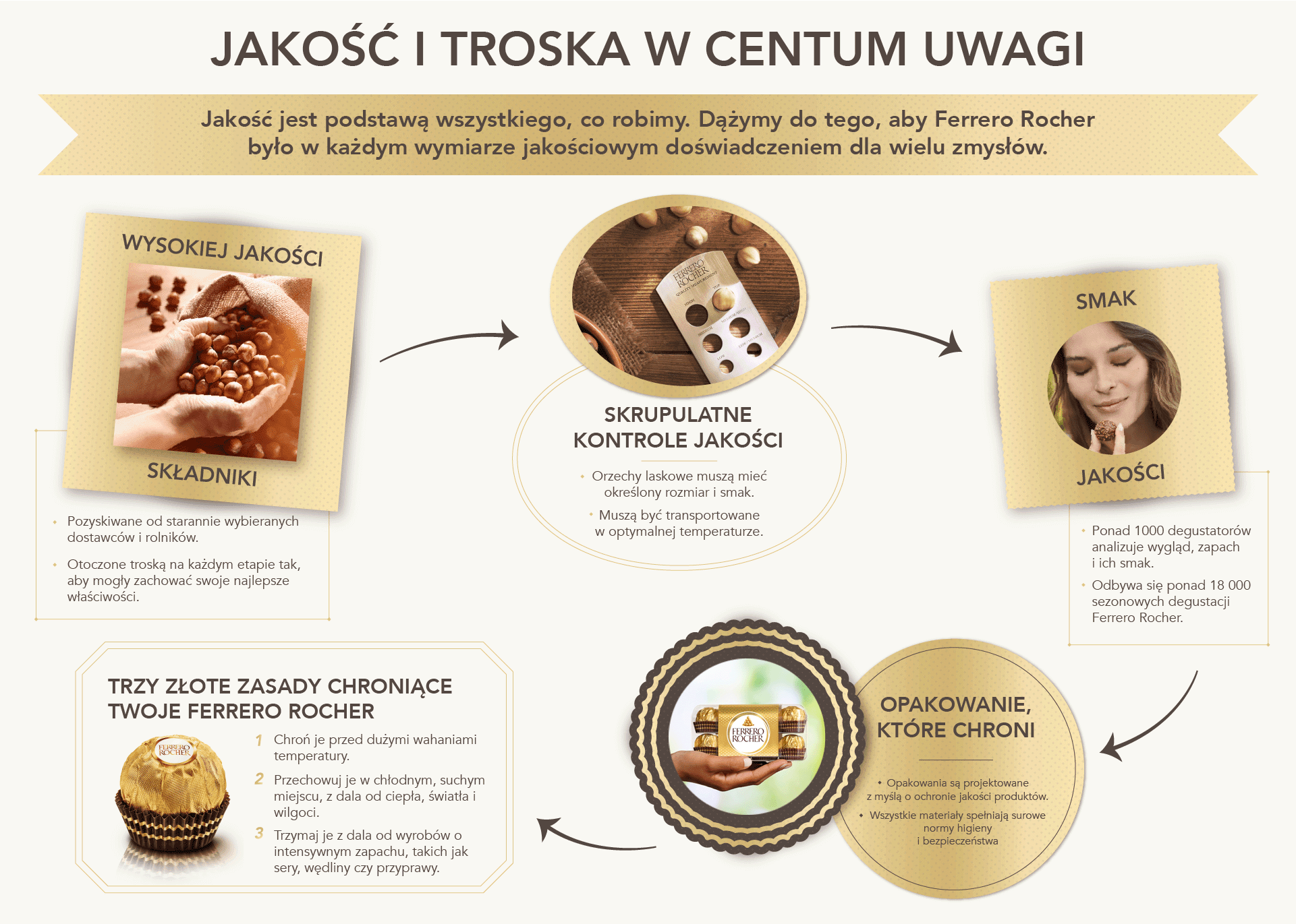 Ferrero Rocher to produkt harmonijnie łączący w sobie dwa światy: badań, rygorystycznych ekspertyz i norm – ze sztuką. Bardzo skrupulatnie podchodzimy do kontroli i utrzymania najwyższej jakości – zaczynając od surowców, a na doznaniach smakowych konsumentów kończąc.