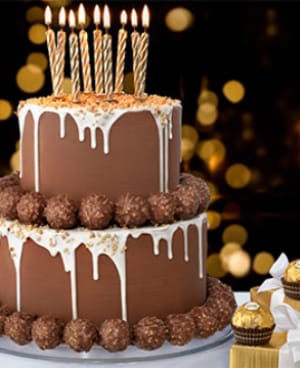 - Coloque a camada superior em cima da base e, para terminar, decore com Ferrero Rocher à volta da base do bolo.