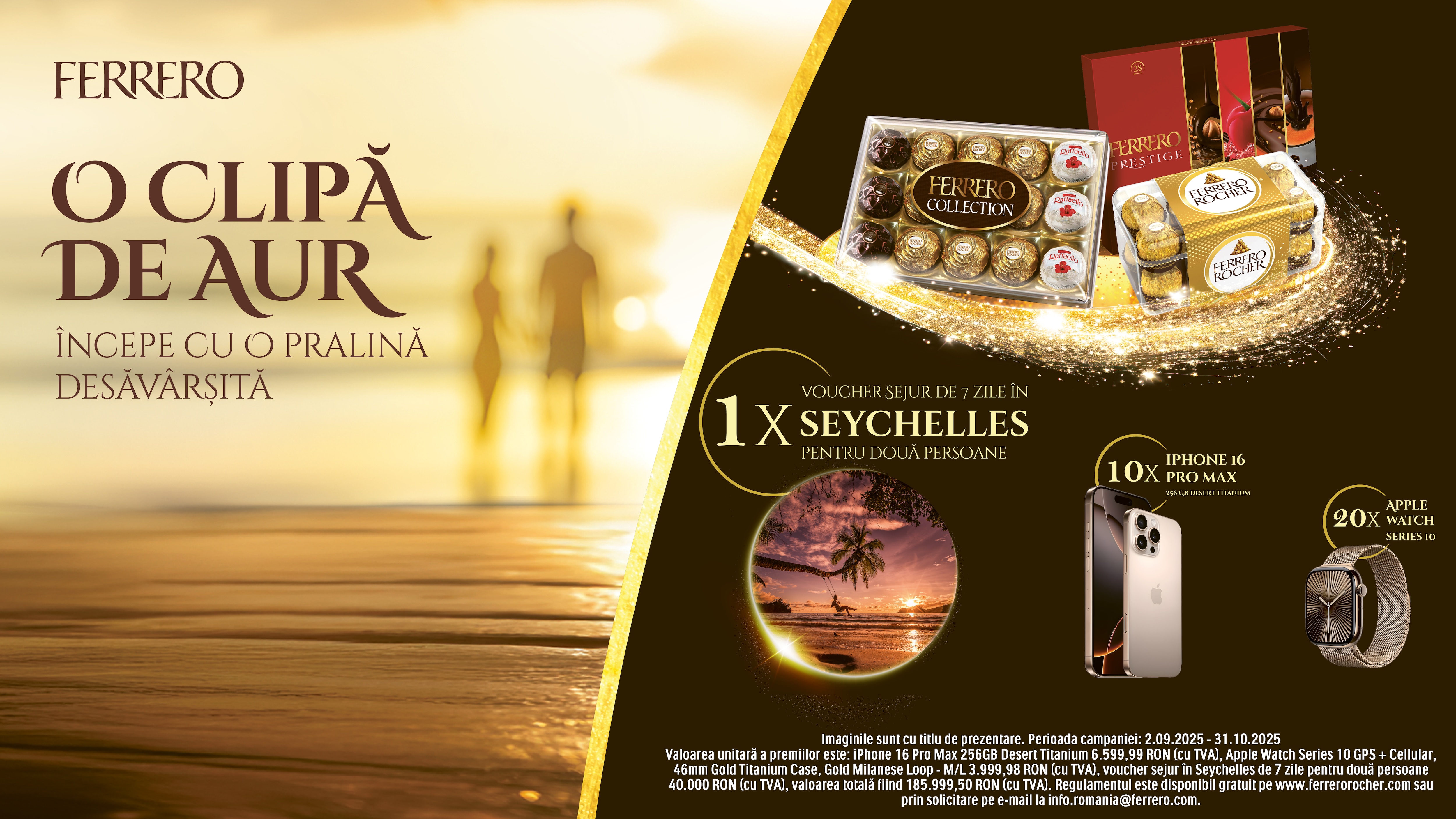 Cumpara praline Ferrero de minimum 30 de ron si poti castiga premii irezistibile! Regulamentul este disponibil gratuit aici.