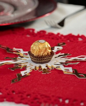 Pregateste o masa festiva deosebita cu ajutorul acestei tehnici rapide si usoare de bricolaj – realizarea fulgilor de nea din hartie. Pune o specialitate Ferrero Rocher in mijlocul fiecaruia si va fi o seara de aur pentru toata lumea!