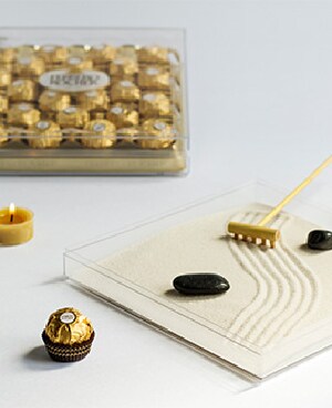 Pastreaza o atmosfera zen acasa sau la birou cu ajutorul acestei idei unice de utilizare a unui ambalaj Ferrero Rocher de 24 de bucati. Dupa ce ai terminat toate specialitatile Ferrero Rocher, scoate ambalajul din interior si umple partea de jos a cutiei cu nisip foarte fin. Adauga obiecte zen de mici dimensiuni, precum lumanari sau pietricele fine, pentru a-ti decora noua oaza de liniste.