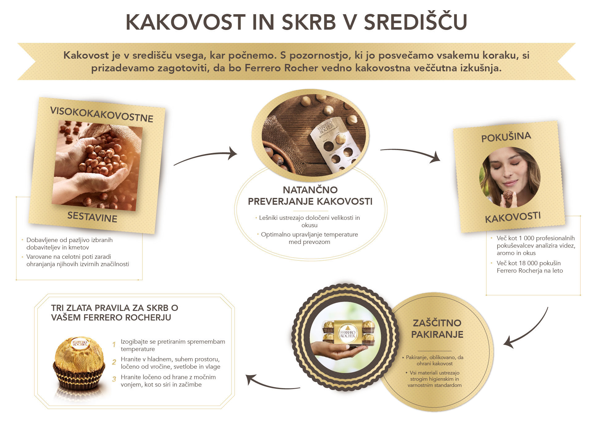 Izdelek rigoroznega strokovnega znanja in umetnosti deluje v popolni harmoniji. V Ferreru smo razvili natančen pristop k nadzoru in zagotavljanju kakovosti, vse od surovin pa do izkušnje okusa prav vsakega Ferrero Rocherja, pri naših potrošnikih.
