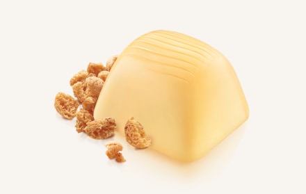 A luscious white chocolate square filled with amaretto flavored cream and crispy amaretto nibs in the center creates a memorable sensory experience.