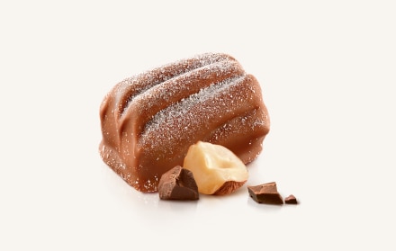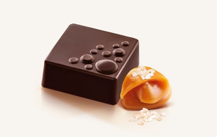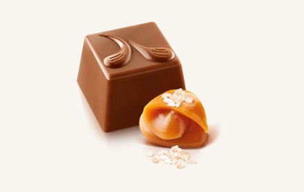 A nutty praline base combines with a soft, buttery salted caramel center in delectable milk chocolate for an elegant bite-sized work of art.