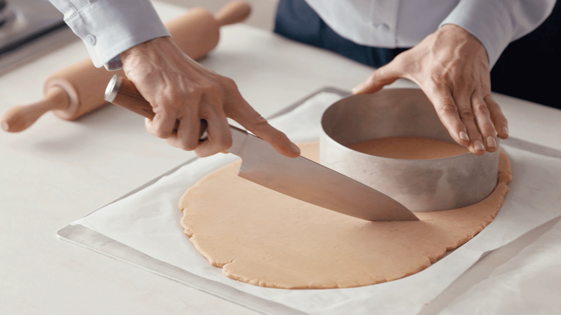 Roll out the chilled dough between two sheets of baking paper. If the dough sticks to the paper, lightly dust the surface with flour.