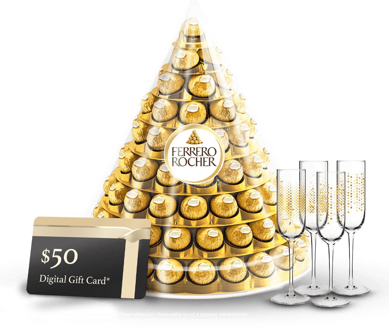 Each Instant Win Prize will consist of one (1) Ferrero Rocher T96 Pyramid box of chocolates (96-piece gift box). Four (4) custom Ferrero Rocher glass champagne flutes, and one (1) digital ReserveBar gift card with a fifty-dollar ($50) value. ARV $100.00 each. Alcohol is not part of the prize.
